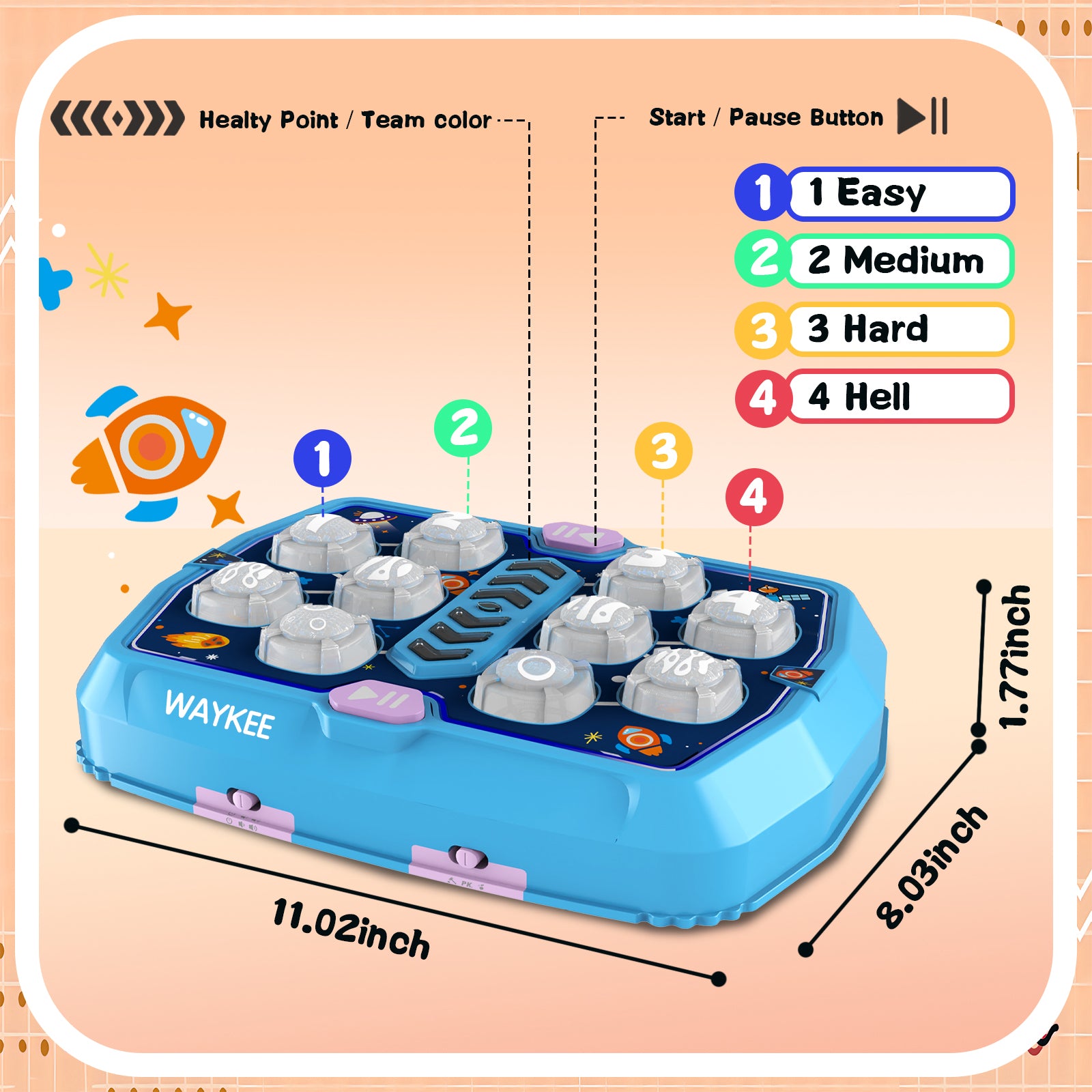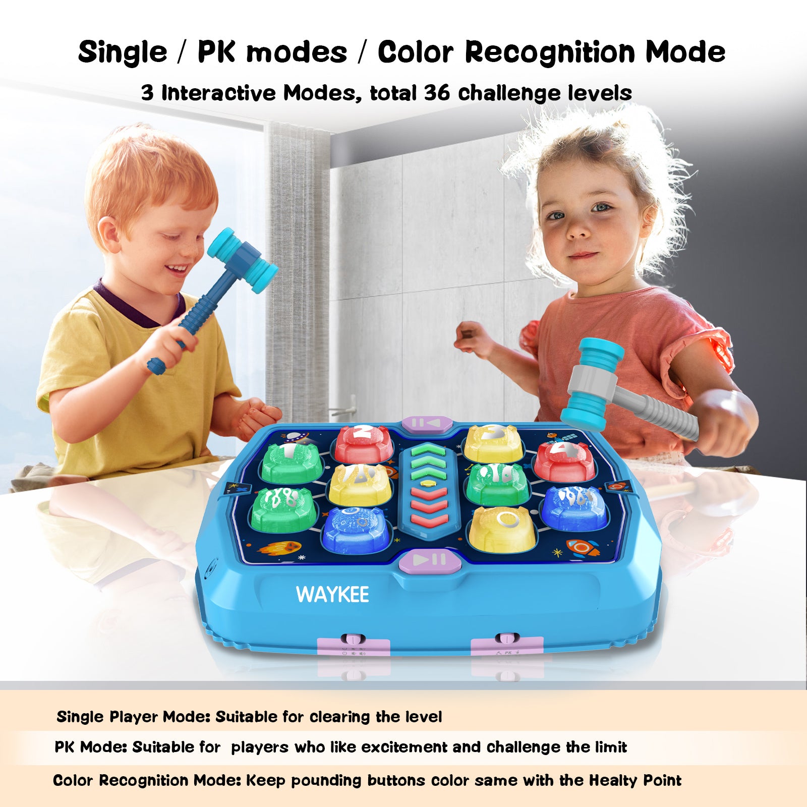 1:Triple the Fun, Triple the Challenge: Our whack a mole game features 3 exciting game modes (Single Player, PK Battle, Color Challenge), 4 adjustable difficulty levels, and a whopping 36 challenge stages. It keeps kids aged 3-8 engaged for hours, delivering explosive fun whether solo or head-to-head. Even adults will love this thrilling party game!
